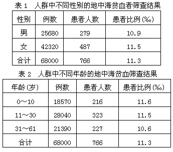 5、选择题 地中海贫血症是我国南方最常见的遗传性血液疾病之一,为了解南方某城市人群中地中海贫血的发病情况,某研究小组对该城市的68000人进行了调查,调查结果如表。下列说法正确的是