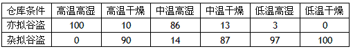 5、选择题  赤拟谷盗和杂拟谷盗是两种仓库害虫,在不同的温度和湿度的试验条件下,两种拟谷盗的相对数量(%)的变化如下表所示。这两种拟谷盗的关系属于