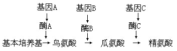 1、综合题 比德尔是一位遗传学家,他选用红色面包霉作为材料。他对6万个孢子进行放射性辐射后,用基本培养基培养。绝大部分孢子都能正常生长,但是有少数孢子不能正常生长,后者可能有各种各样的突变,其中有的可能与精氨酸有关。因为精氨酸是红色面包霉正常生活所必需的。经过多种组合的实验,再根据突变性状的遗传情况分析,红色面包霉中精氨酸合成的步骤是(如下图):