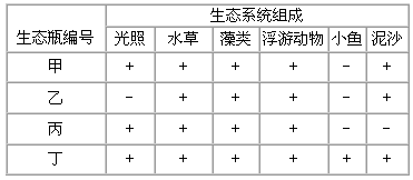 5、选择题 某兴趣小组设计了以下实验来验证生态系统的一些相关问题:取4个密闭、透明的生态瓶,各瓶内的组成和条件见下表(图中“+”表示有,“-”表示无)。经过一段时间的培养后,下列判断错误的是