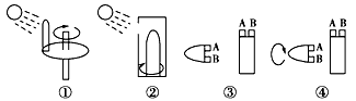 1、选择题 对胚芽鞘进行如下图的①~④实验,其中旋转均为匀速旋转,一段时间后停止旋转时,实验①、②装置仍停止在如下图位置,则四个胚芽鞘的生长方向依次是