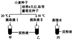 2、选择题 小麦种子萌发时产生淀粉酶等酶,将淀粉水解为麦芽糖、葡萄糖等。小麦种子萌发的最适温度为30℃左右。按下图将小麦种子分别置于20℃和30℃培养箱中培养4天,依次取等量的萌发种子分别制成提取液Ⅰ和提取液Ⅱ。取3支试管甲、乙、丙,分别加入等量的淀粉液,然后加入等量的提取液和蒸馏水,45℃水浴保温5分钟,立即在3支试管中加入等量的斐林试剂并用55℃水浴加热2分钟,摇匀后观察试管中的颜色。结果是