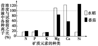1、选择题 用完全营养液在两个相同的容器内分别培养水稻和番茄苗,假设两植物的吸水速率相同,一段时间后,测定营养液中各种离子与试验开始时各种离子浓度之比,结果如图所示: