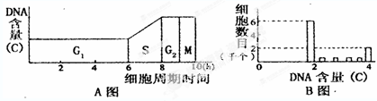 5、选择题 A图表示在一个细胞周期中的细胞核DNA含量的变化曲线;B图表示处于一个细胞周期中各个时期细胞数目的变化(用特殊的方法在一个培养基中测得的),下列叙述错误的是 ?