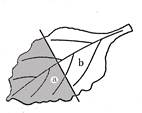 1、选择题 将一植物在黑暗环境中放置48小时,然后将其一片叶的主脉切断(如下图),在阳光下照射4小时,将此叶片经过脱水处理后,再用碘酒处理后,发现a部位呈现红棕色,b部位呈蓝色。这个实验证明