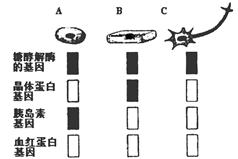 5、选择题 下图示人体三种细胞内的部分基因及它们的活动状态(其中黑色表示基因表达),糖酵解指的是葡萄糖分解成丙酮酸。据图得出的下列结论中错误的是