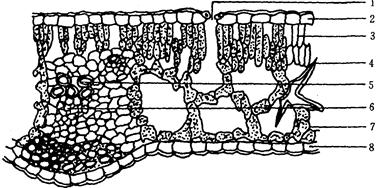1、选择题 下图为一种叶子的横切面,其中“4”是什么类型的组织(细胞)?
