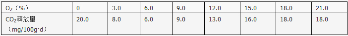 本题解析:考查对呼吸类型的理解和图表分析能力。分析表格可知,单纯无氧呼吸(氧气浓度为0)时释放的CO2为20.0 mg/100g·d,而有氧呼吸最旺盛时(氧气浓度大于等于18%)释放的CO2为18.0 mg/100g·d,故A对;氧气浓度为6%时,由表中数据不能得出氧气的吸收量,故不知其和CO2释放量的对比关系,故不能判定呼吸类型,B错;氧气浓度大于18%后,CO2释放量不再随氧气浓度的变化而变化,故氧气不再是有氧呼吸的限制因素,C对;将表中数据以曲线图的形式表示不难看出D是正确的。