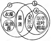 本题解析:试题分析:通过对概念图的分析,我们发现丙图中a所含的支原体和烟草花叶病毒一个为原核生物,一个为病毒,二者的结构不同,但它们都是异养生物,都能发生基因突变。b包含硝化细菌、支原体和烟草花叶病毒三种生物,其中硝化细菌为生产者,支原体和烟草花叶病毒为消费者。c包含衣藻、金鱼藻、硝化细菌和支原体,既有真核生物也有原核生物,其中硝化细菌和支原体没有叶绿体。所以A选项正确。