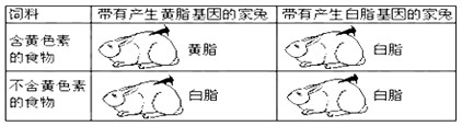 1、选择题 家兔体内是否产生黄脂或白脂,受遗传因素的影响。生物兴趣小组选择健康的黄脂家兔和白脂家兔从事研究。将两种兔子分成两组,分别喂饲不同饲料: 一组饲料中含黄色素的食物;另一组的饲料中则不含黄色素的食物,同学们所做实验的家兔体内产生脂质的颜色如下图所示:试问实验结果可获得下列何种结论