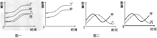 5、连线题 生态系统中生物与生物间具有直接或间接的关系,某生物小组用生活在同一水体中的四种生物进行了科学实验。其中甲生活在水体上层,乙、丙在中上层,丁在水底淤泥中,且只有丁细胞结构中无核膜包围的细胞核。其中图一表示分别单独培养甲、乙、丙、丁时各种群数量变化,图二中的3个图是混合培养时种群数量变化,据图回答: