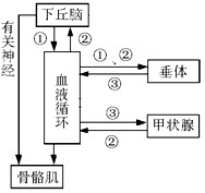 4、选择题 下图表示动物体体温调节过程的部分示意图,图中①、②、③代表激素,当某人走出房间进入寒冷环境中,下列有关叙述正确的是