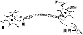 2、选择题 分别刺激右图Ⅰ、Ⅱ、Ⅲ、Ⅳ四处,不能引起肌肉收缩的是