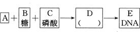 本题解析:从图示可知,A是碱基,B是脱氧核糖,C是磷酸,D是脱氧核苷酸,碱基为A、T、G、C四种,磷酸和脱氧核糖交替排列构成DNA基本骨架。所以B选项正确。
