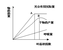 4、选择题 下图表示叶面积指数与呼吸作用和光合作用产物积累的关系(注:叶面积指数是指植物叶面积的总数与生长该植物的地面积之比)。下列有关说法错误的是