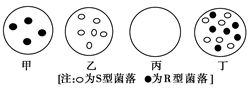 4、选择题 在下列甲、乙、丙、丁四组相同培养基上分别接种正常R型菌、正常S型菌、加热杀死的S型菌、加热杀死的S型菌和正常R型菌,培养一段时间,观察菌落的生长情况如下图。下列有关叙述正确的是( )