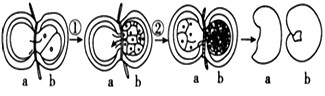 4、选择题 细胞核具有什么功能?科学家通过下列实验(见下图)进行探究:①用头发将蝾螈的受精卵横缢为有核和无核的两半,中间只是很少的细胞质相连,结果无核的一半(a)停止分裂,有核的一半(b)能继续分裂;②b部分分裂到16~32个细胞时,将一个细胞核挤到不能分裂的a部分,结果a部分开始分裂、分化,进而发育成胚胎。下列叙述中,不正确的是
