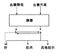 选择题 下图表示人体内血糖调节的部位图解,图中a、b表示参与血糖调节的两种激素。以下说法正确的是A.激素a和激素b相互协同,共同维持血糖的稳定B.胰岛B细胞产生激素a,能促进非糖物质转化为葡萄糖C.胰岛A细胞产生激素b,能促进肝脏细胞的糖原分 91Exam.org解D.激素a能与组织