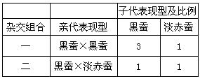 4、填空题 在家蚕遗传中,幼蚕体色的黑色与淡赤色是由一对等位基因(D、d)控制的相对性状,不同杂交组合得到的子代表现型及数量比见下表。请回答问题: