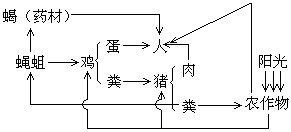 1、连线题 如图所示,为农民采用的笼养蝇蛆法而形成的食物网。(说明:鸡粪中含有较多的营养物质未被消化,因此可再添其它饲料养猪,以生态学的角度看,这是一个理想的生态系统)按图回答: