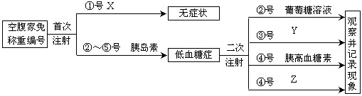 (1)③注射的Y与④注射的胰高血糖素在调节血糖浓度方面有协同作用,则Y为___________。①⑤两组作为②③④组的空白对照,则X、Z溶液都是_____________