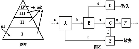 4、连线题 下图甲为某湖泊生态系统的能量金字塔简图,其中Ⅰ、Ⅱ、Ⅲ、Ⅳ分别代表不同的营养级,m1、m2代表不同的能量形式。图乙表示能量流经该生态系统某一营养级的变化示意图,其中a~g表示能量值的多少。请据图作答:
