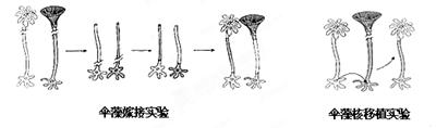1、选择题 伞藻由“帽”、柄和假根三部分构成,细胞核在假根内。科学家用伞形帽和菊花形帽两种伞藻做嫁接和核移植实验,结果如下图。有关描述最合理的是?