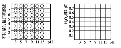 3、选择题 为探究H2O2酶对H2O2分解速率的影响,实验设计如下:①制备30%新鲜猪肝研磨液;②设置了如下(左图)实验组,横向为梯度pH,纵向为不同量的新鲜猪肝研磨液;③每支试管加入等量且足量H2O2溶液,并设置相同且适宜的反应温度;④设计实验记录表如下(右图);⑤以加入猪肝研磨液后同等时间内测得的H2O2减少量为实验结果作记录。下列实验结果预测及其分析,不正确的是