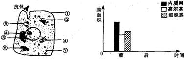 5、选择题 下面左图表示某淋巴细胞,膜外颗粒为抗体;下图是该细胞在抗体分泌前几种生物膜面积的示意图。下列对于该细胞以及抗体合成、加工及分泌过程的叙述中,正确的是: