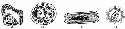 本题解析:从图中可知,A是高等植物细胞,B是动物细胞,C是原核细胞,D是没有细胞结构的病毒。其中A与B相比,最主要的区别是A无中心体,B无叶绿体、细胞壁和液泡。A、B、C、D中与其它三项有明显区别的一项是D,它自身没有酶系统和细胞结构,所以其合成自身蛋白质的场所是宿主细胞的核糖体上。若将A放入lmol/L的KN03溶液中,产生质壁分离和复原现象的过程中,物质进出细胞的方式是自由扩散、主动运输;从生态系统的成分看,具有C结构的生物可作为分解者、消费者、生产者,如硝化细菌、光合细菌属于生产者,根瘤菌属于消费者,乳酸菌属