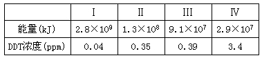 5、选择题 表是Ⅰ、Ⅱ、Ⅲ、Ⅳ四个种群在一个达到生态平衡的环境中所含有的总能量和残留农药DDT的平均浓度。试写出这四个种群的最简单的能量流动渠道应是