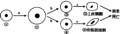 5、选择题 下图为人体细胞的分裂、分化、衰老和凋亡过程的示意图,图中①—⑥为各个时期的细胞,a~c表示细胞所进行的生理过程。据图分析,下列叙述正确的是[???? ]