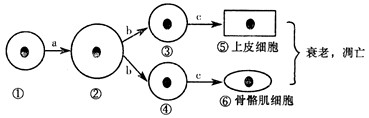 4、选择题 下图为体细胞的分裂、分化、衰老和凋亡过程的示意图,图中①~⑥为各个时期的细胞,a~c表示细胞所进行的生理过程。据图分析,下列叙述正确的是[???? ]