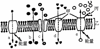 4、选择题 下图为物质跨膜运输示意图(甲、乙、丙代表物质,a、b、c、d、e代表运输方式)。下列叙述错误的是