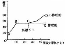 1、选择题 苍耳的果实中有两种种子,一种是休眠的(原因是种皮不透氧和有萌发抑制剂),一种是不休眠的种子。图是两颗种子萌发试验记录制作的曲线图,下列说法不正确的是