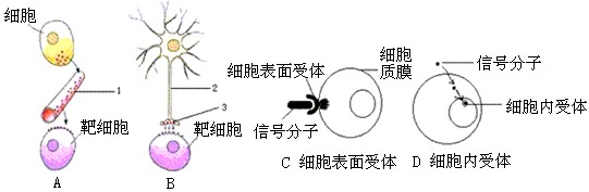 1、填空题 细胞通讯是细胞间或细胞内通过高度精确和高效地发送与接收信息的通讯机制,对环境作出综合反应的细胞行为。下图A、B所示细胞通讯方式为人体内常见的两种不同类型的信号分子及其信号传导方式,C、D表示不同的信号分子对靶细胞作用的方式。请据图回答问题: