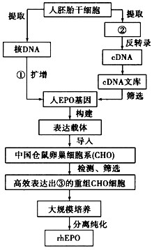 5、连线题 红细胞生成素(EPO)是体内促进红细胞生成的一种糖蛋白,可用于治疗肾衰性贫血等疾病。由于天然EPO来源极为有限,目前临床上使用的红细胞生成素主要来自于基因工程技术生产的重组人红细胞生成素(thEPO),其简要生产流程如下图。请回答: