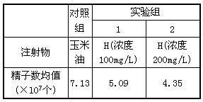 1、填空题 环境激素是指由于人类的生产和生活活动而排放到周围环境中的某些化学物质。为研究环境激素H对小鼠产生精子数的影响,用玉米油和环境激素H分别处理对照组和实验组雄性小鼠(每千克体重注射12.5mL,每天1次,连续21天,n=20)。实验结束后,对每只小鼠产生的精子计数。实验内容及结果见下表。