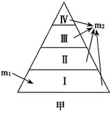 2、连线题  下图甲为某湖泊 生态系统的能量金字塔简图,其中Ⅰ、Ⅱ、Ⅲ、Ⅳ分别代表不同的营养级,m1、m2代表不同的能量形式。图乙表示能量流经该生态系统某一营养级的变化示意图,其中a~g表示能量值的多少。请据图作答: