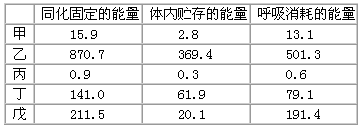 4、选择题 下表是对某生态系统营养和能量流动情况的调查结果[单位:102kJ/(m2·a)],表中甲、乙、丙、丁分别代表不同的营养级,戊为分解者。下列对该生态系统营养关系的叙述正确的是