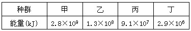 1、选择题 下表是一个生态系统中甲、乙、丙、丁四个种群所含能量