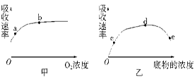 5、选择题 下图甲、乙分别是洋葱根尖在不同含氧量及不同底物浓度情况下(其他条件适宜),从含硝酸钾的全营养液中吸收硝酸根离子的吸收速率曲线图。相关描述不正确的是