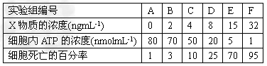 (3)为了研究X物质对动物细胞的影响,某研究小组用不同浓度的X物质将细胞处理24小时。然后测量各组细胞内ATP的浓度和细胞死亡的百分率,经过多次试验后:所得数据如图所示: