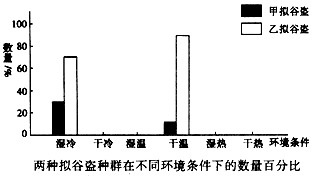 (1)根据上表数据,请在上图提供的坐标中绘制湿冷、干温条件下拟谷盗数量百分比的柱状图。