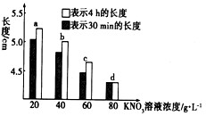 3、选择题 将同一新鲜马铃薯块茎切成4根粗细相同、长为5cm的条,再将这4根马铃薯条分别放在不同浓度的KNO3溶液中,30min和4h后测量每一根的长度,结果如下图所示。下列结论错误的是