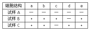 1、选择题 用电子显微镜观察A、B、C的细胞结构,观察到细胞结构a~e具有如下特征:abc均由双层膜构成,其中a的膜上有小孔,而b、c没有小孔;从d的周围发出丝状物;e由几个囊状结构重叠而成。将试样A、B、C的细胞结构有无作表如下:(+:存在;-:不存在),由此判断,试样A、B、C分别可能是