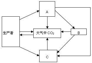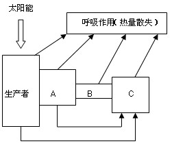 3、简答题 物质循环与能量流动是生态系统的两个重要功能。下图一中的A、B、C和生产者表示生态系统中的生物成分,图二中的A、B、C则与图一中的相对应。请根据下列图示建立生态系统的物质循环与能量流动模型。