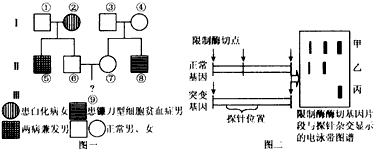 2、连线题 人的正常与白化病受基因A和a控制,正常与镰刀型细胞贫血症受基因B和b控制,两对基因分别位于两对常染色体上,假设白化病基因与相对应的正常基因相比,白化基因缺失了一个限制酶的切点。图一表示某家族遗传系谱图,图二表示甲、乙、丙3人白化基因或相对应正常基因的核酸分子杂交诊断结果示意图。据图回答下列问题。