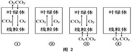 2、选择题 下图1表示夏天某一晴天一昼夜中某棉花植株CO2的吸收和释放曲线;图2表示该棉花叶肉细胞两种细胞器的四种生理活动状态。则图1中时间a、b、c、d依次发生了图2所示的哪项生理活动( )