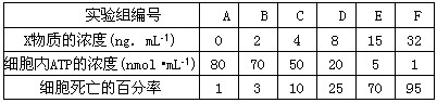 1、综合题 为了研究X物质对动物细胞的影响,某研究小组用不同浓度的X物质将细胞处理24小时。然后测量各组细胞内ATP的浓度和细胞死亡的百分率,经过多次实验后,所得数据如图所示: